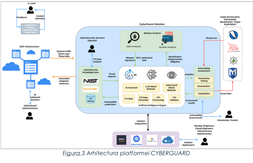 - (T2.3) Proiectarea Arhitecturii Sistemului (CYBERGUARD Architecture): Proiectarea arhitecturii platformei CYBERGUARD, asigurând o structură robustă, scalabilă și interoperabilă pentru integrarea instrumentelor din WP3 și WP4
