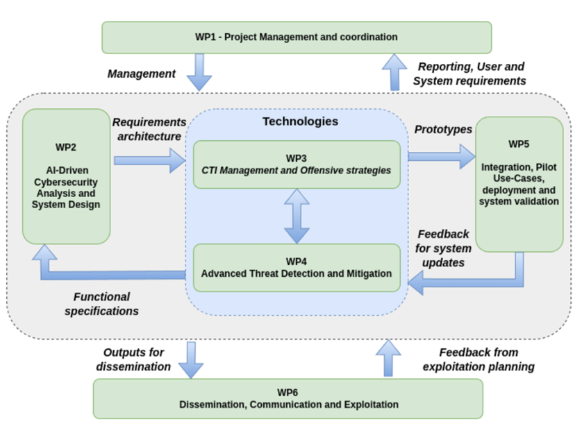 - Definirea Arhitecturii (T2.3) (în desfășurare): această activitate a început proiectarea arhitecturii platformei, definind modul de integrare a componentelor din WP3 (CTI și Offensive) și WP4 (Detecție și Mitigare)